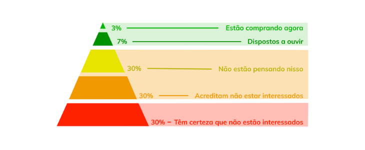 A ideia por trás dela é bastante simples! Seu público está distribuído da forma como a imagem acima mostra. Então, já que apenas 10% tem interesse no produto e 30% não está interessado em oferta alguma, a pergunta que fica é: o que você está fazendo para se tornar relevante para os demais 60%?
